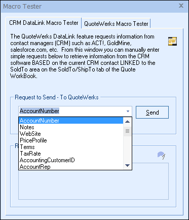 Simply select the field from the CRM/PSA system that you'd like to test and click the [Send] button. This will show you the data that will be pulled if you setup the DataLink for this field in QuoteWerks.
