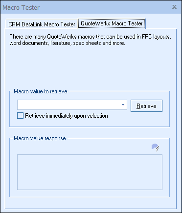 The QuoteWerks Macro Tester is a great way to test a macro for your FPC layouts, Word layouts, Literature documents, Spec sheets, and other documents in QuoteWerks. This allows you to check that the macro you want to add to your output documents will print the information you need it to. This is a great way to quickly test a variety of macros for your documents to ensure you are adding the correct macro to your documents.