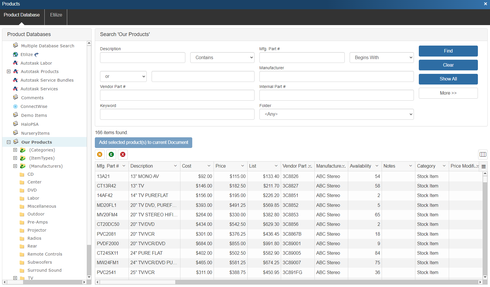 On the Product Lookup window, select the native product database that you would like to maintain such as the default “Our Products” database. Any product databases that you have previously created will appear in this list.