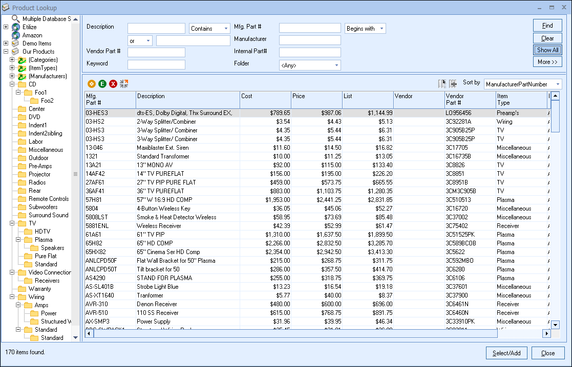 On the Product Lookup window, select the native product database that you would like to maintain such as the default “Our Products” database. Any product databases that you have previously created will appear in this list.