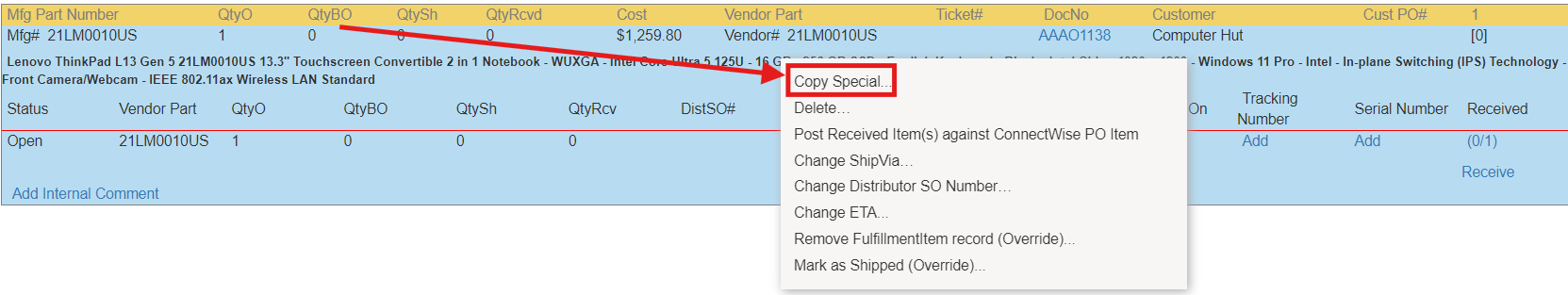 The purchase order items can be accessed from either the Purchase Orders tab or the Ordered Items tab.  The individual items tracking numbers, serial numbers and shipping statuses will update automatically when ordering electronically.  For any items that were not ordered electronically, you can manage their statuses, tracking numbers, and serial numbers through the Purchase Orders and Ordered Items tabs. The right-click menu options will only be available on the Purchase Orders tab.