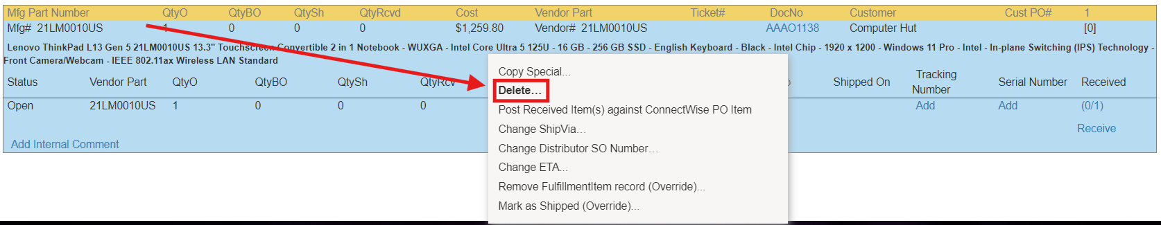 To delete an item, navigate to the Purchase Orders tab. Select an item from the selected purchase order, right-click on it, and click Delete....