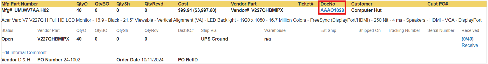 The document number for the item is a link that can be clicked to open that document in QuoteWerks.
