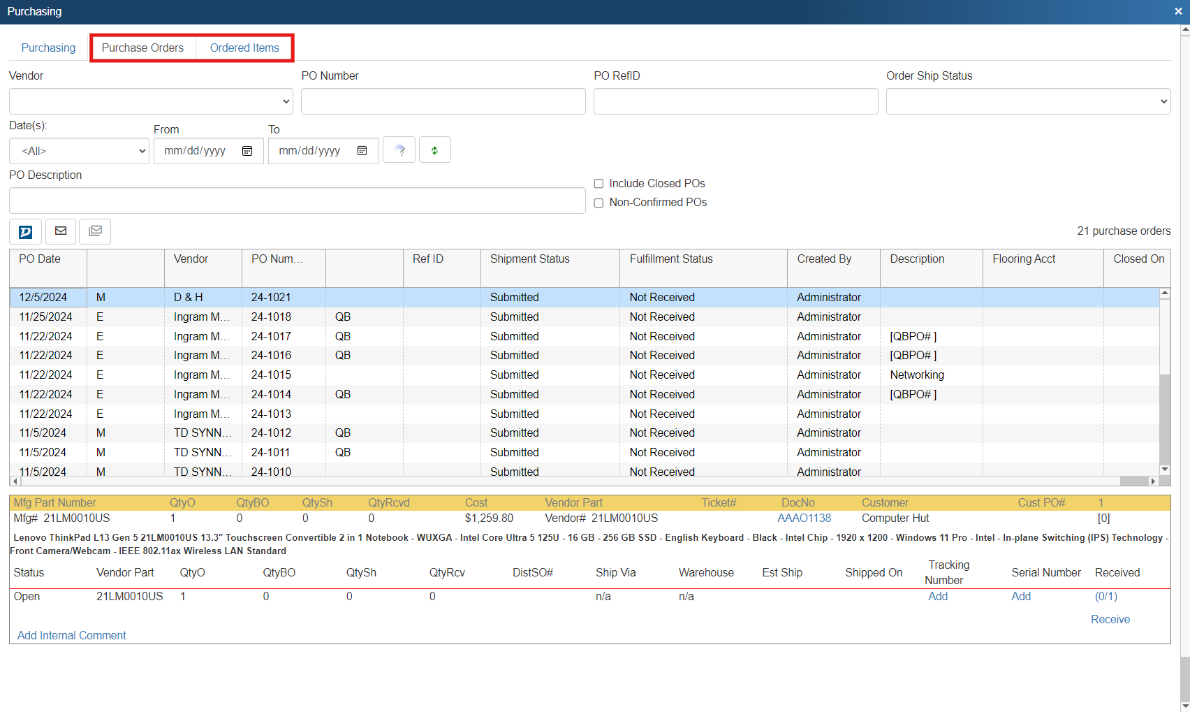 The Purchase Orders tab will let you view all your purchase orders and QuoteWerks orders on one screen. You can quickly filter by date, vendor, and order status. You can also leave these fields blank to view all available documents.