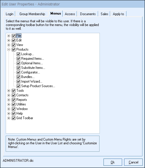 On this tab you can select the menus that will be visible to the user, click on the menu heading to expand the list of menu command. Simply put a check mark next to the menu option the user will be allowed to access.