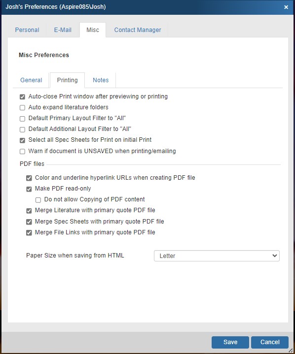 This selection allows you to choose whether you want PDFs generated from HTML (Etilize spec sheets, Purchasing module POs, etc) to render as either Letter size or A4.