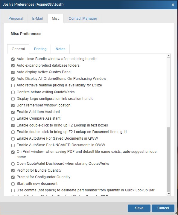 When this option is checked a warning message will notify the user that the current open quote that is trying to be emailed or printed has not been saved in QuoteWerks yet.