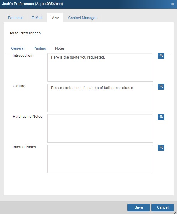 Note: This default text is user specific; only you will have it available when creating quotes. |
