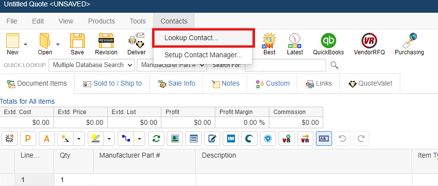 1.Start by navigating to the Contacts menu at the top of the quote workbook and select “look up contact”