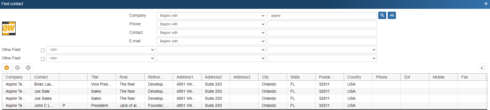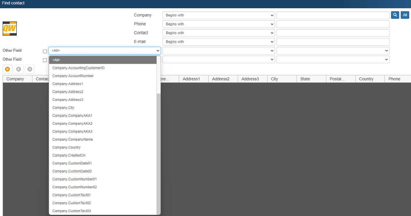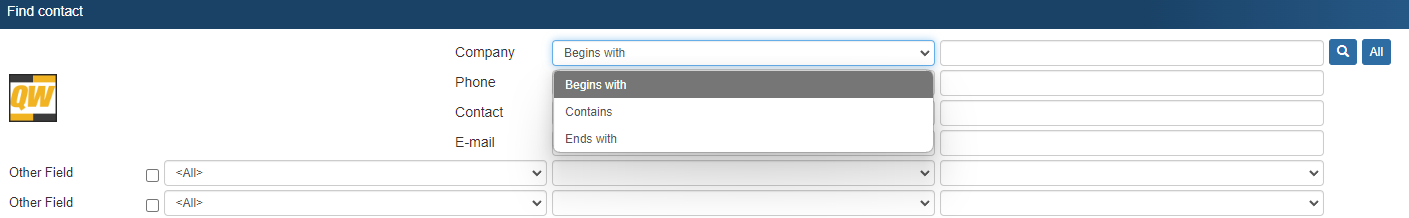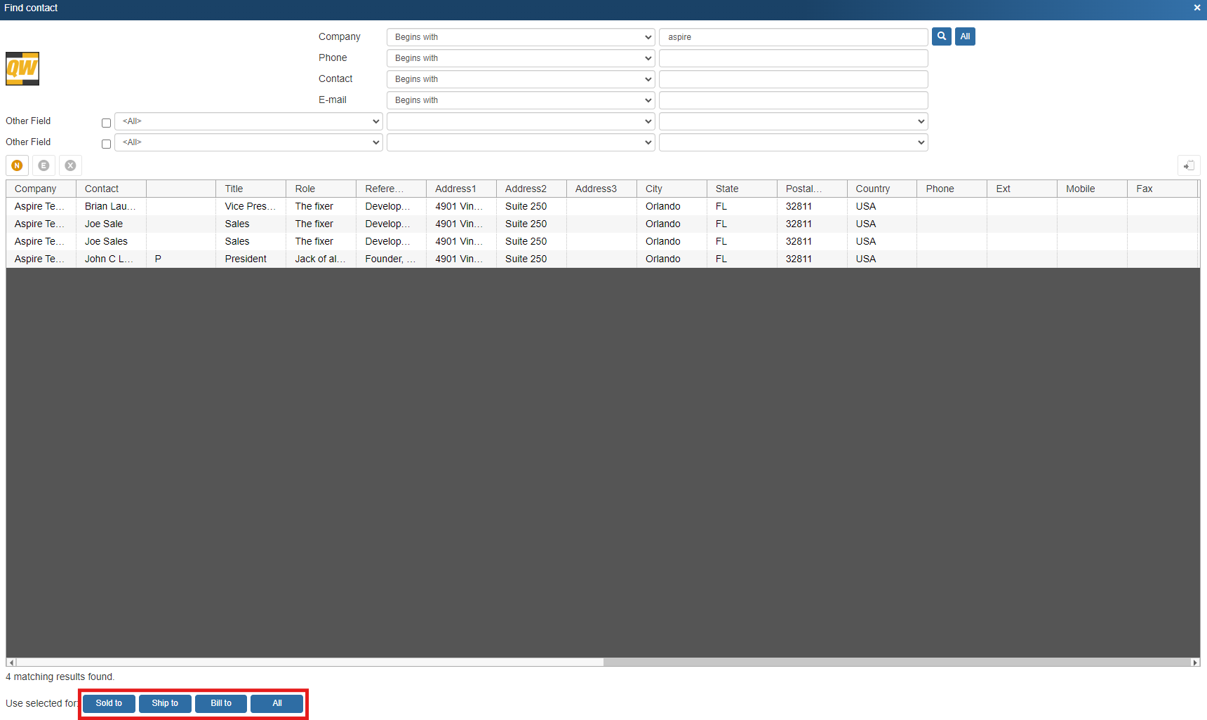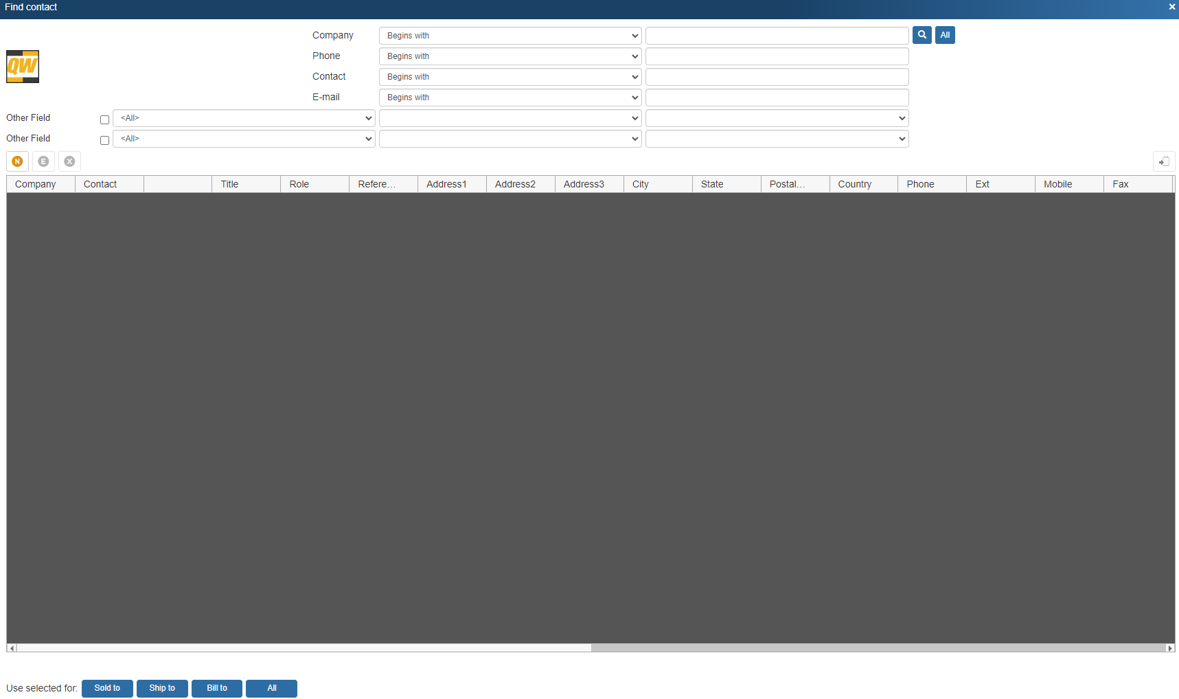 3.Within the Lookup QuoteWerks Contact window you have the ability to search 4 standard fields and 2 “Other” fields using standard operators like Begins With, Contains, and Ends With.
