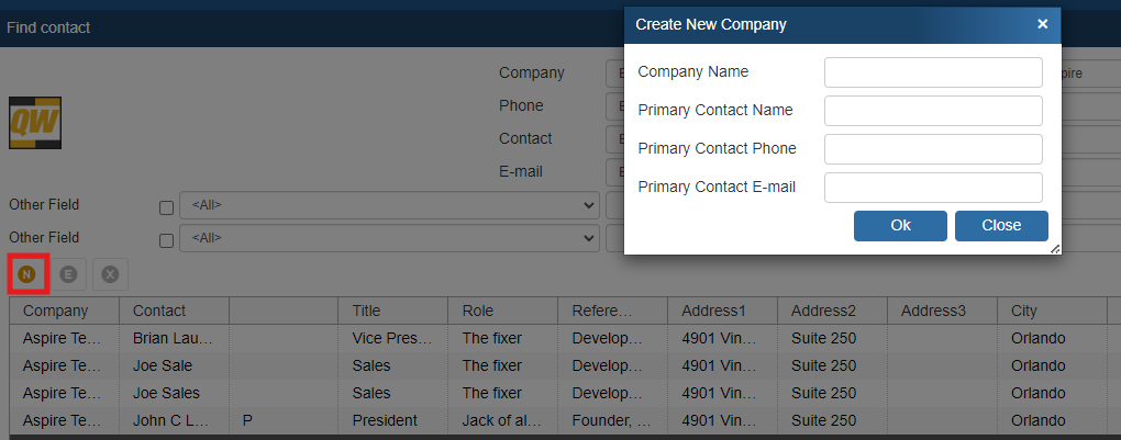 ) allows you to create a new Company. To save the new contact you must enter both a Company Name and Primary Contact Name and hit OK.