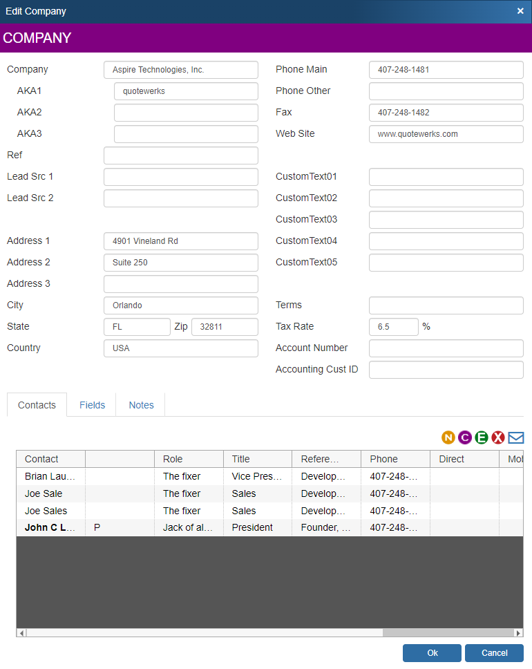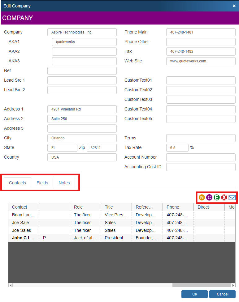Adding, editing, or removing a Company in the QuoteWerks Native Contact Manager