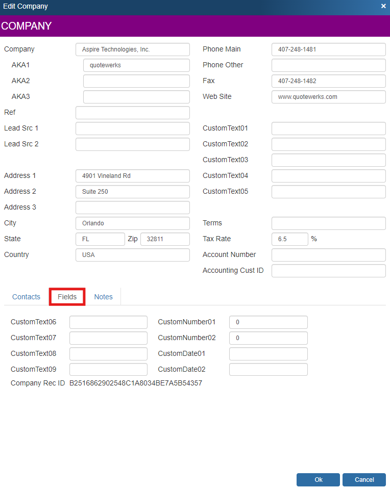 •The Fields tab allows you to view, change, or edit Custom Text, Number and Date Fields associated with the company.