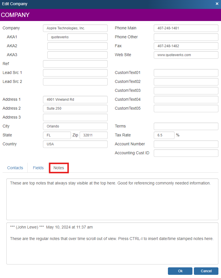 You can add or edit a contact from within the Edit Company window. You also have the ability to view and edit some account fields, configure additional custom text, number, and date fields, and add or view company notes.