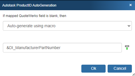 To use the auto-generation feature, select an option other than ManufacturerPartNumber from the Map QuoteWerks Field drop-down box, then click the [PartNumber generation options] button.