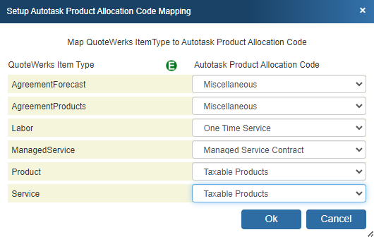 QuoteWerks Item Type to Autotask Product Allocation Code mapping