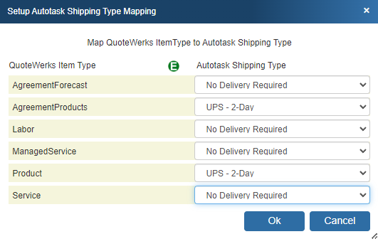 QuoteWerks Item Type to Autotask Shipping Type mapping