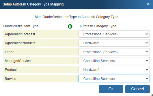 QuoteWerks Item Type to Autotask Categories/SubCategories mapping