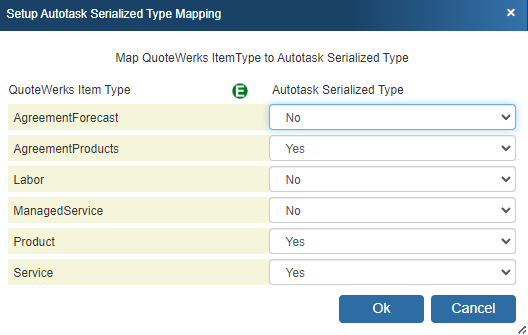 QuoteWerks Item Type to Autotask Serialized Type mapping