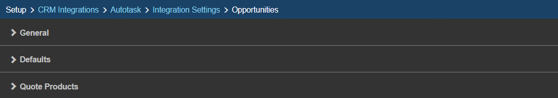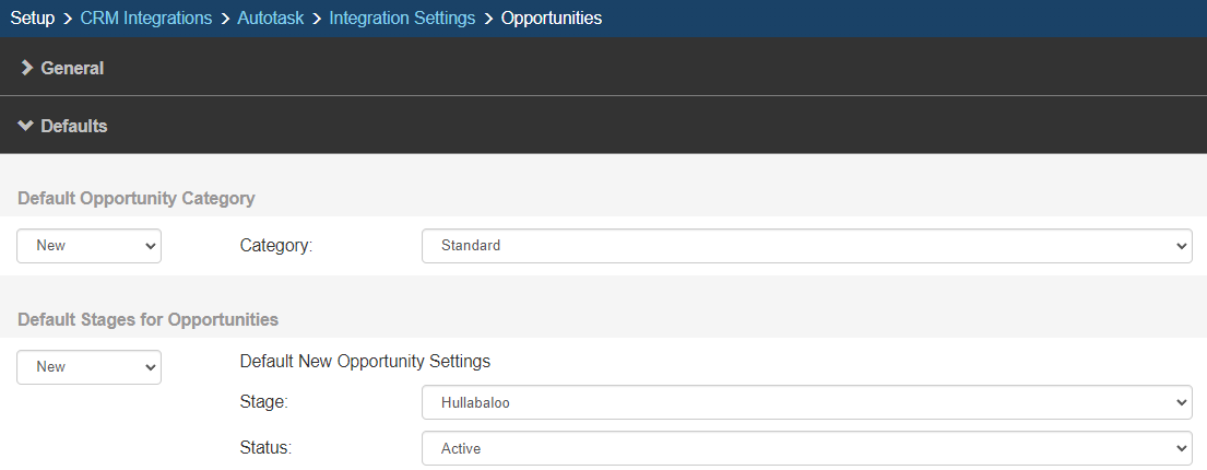 Here you will define the defaults for the creation of Autotask Opportunities.