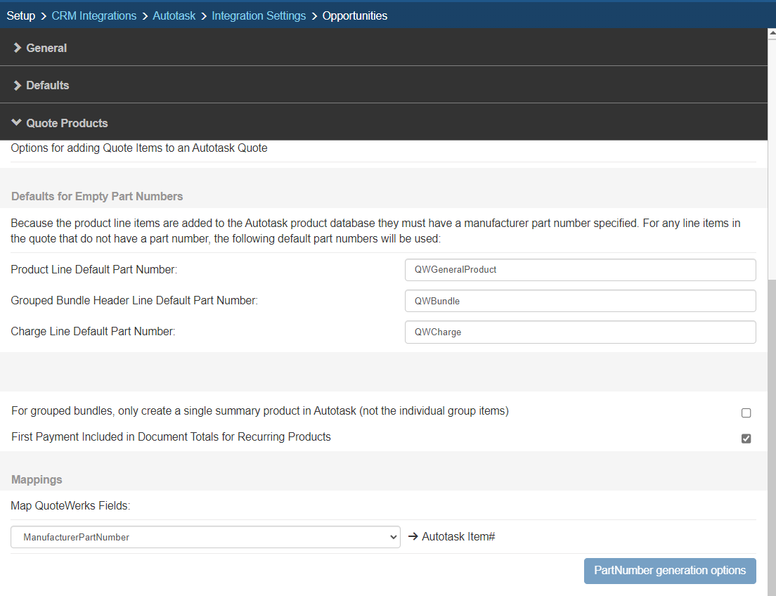 You can choose which field in QuoteWerks to map to the corresponding field (ItemName, PartNumber, etc.) in your CRM. You can select the ManufacturerPartNumber, InternalPartNumber, ItemType, and more.