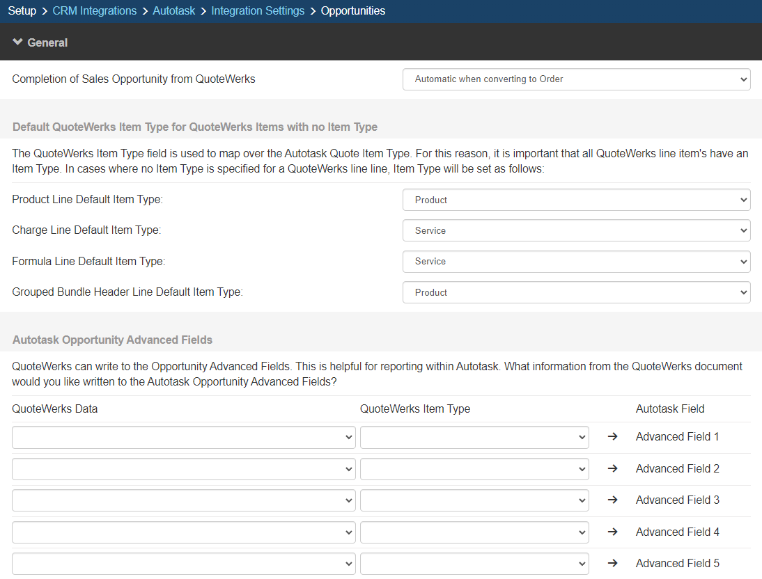 Here, you can map your QuoteWerks Item Types to your Autotask Quote Item Type.