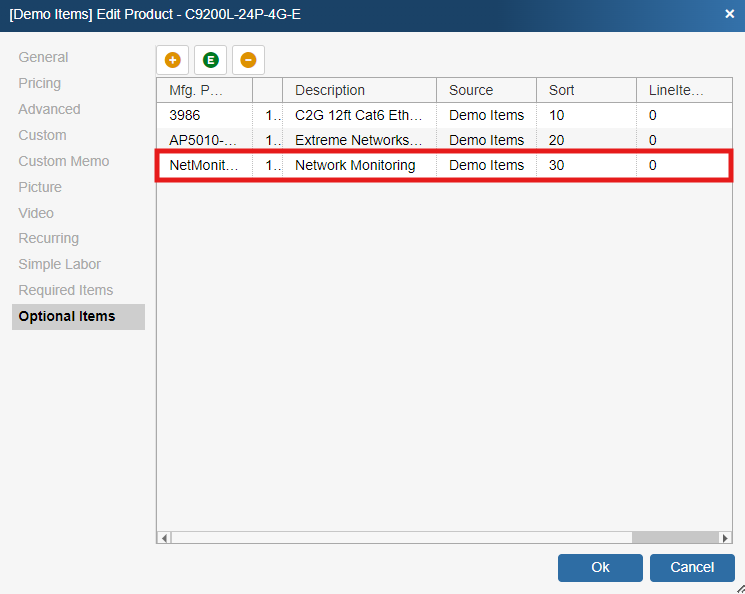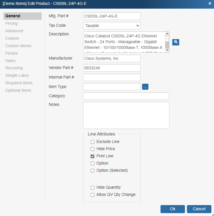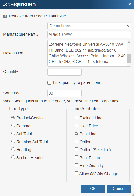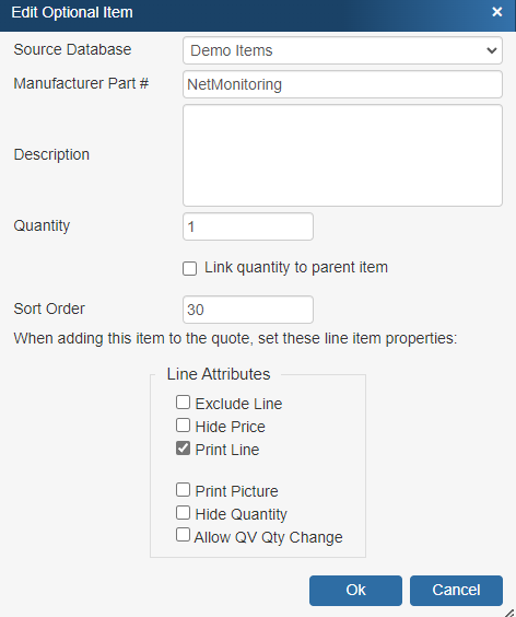 6. In the Edit Optional Item window you can configure a number of settings. Here you can change the Manufacturer Part #, Description, Quantity, Sort Order, Line Type, and Line Attributes. These settings are described in more detail under Optional Item Properties.