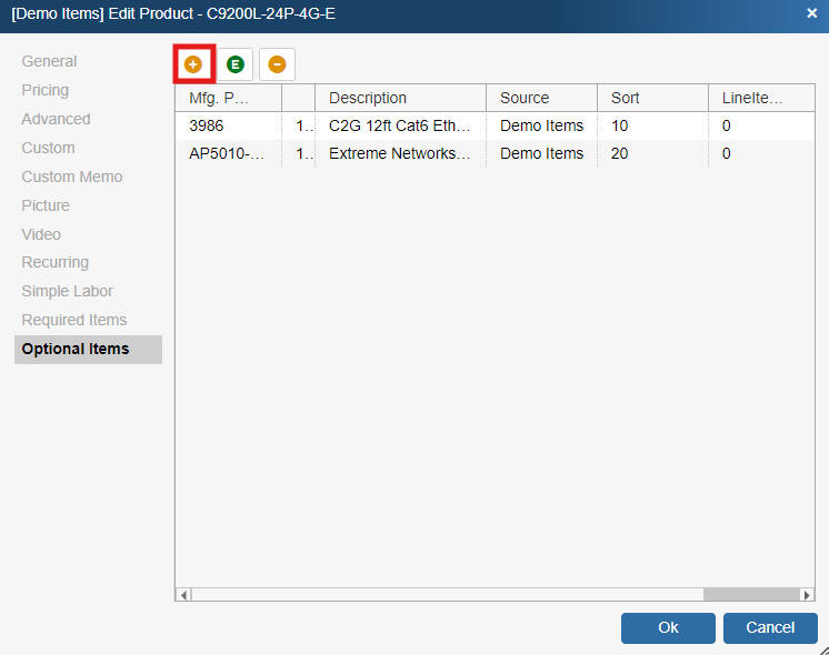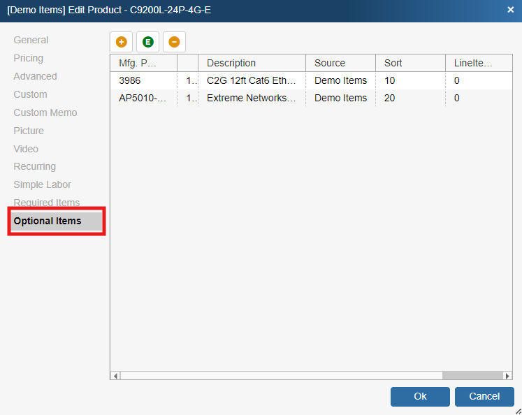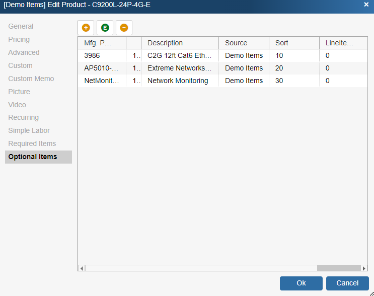 Note: Items used for Optional Items must have a unique manufacturer part number. |