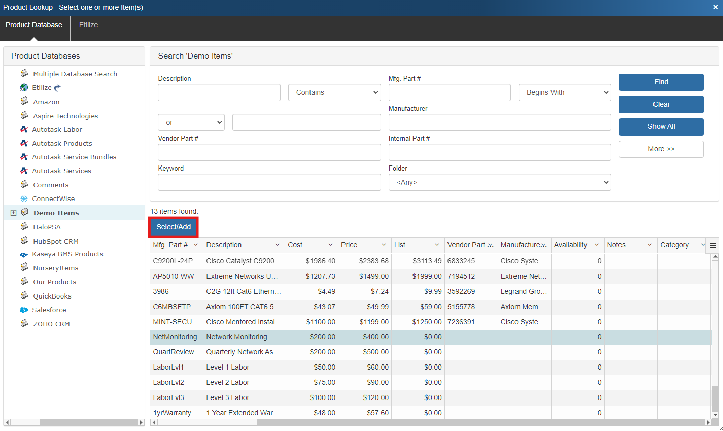 5. Search for the item(s) you wish to include as optional items using the Product Lookup window. Select them and click Select/Add to add them to the list of Optional Items.