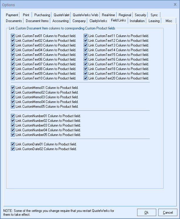 Users can map Custom Product fields to pull non standard field information from a product database into QuoteWerks. The Field Links tab controls which Custom fields are sent to the document from the product data source. By default these are all selected. Only in rare cases would one want to deselect these as it would cause the selected Custom field(s) to not be pulled from the product data source into QuoteWerks.