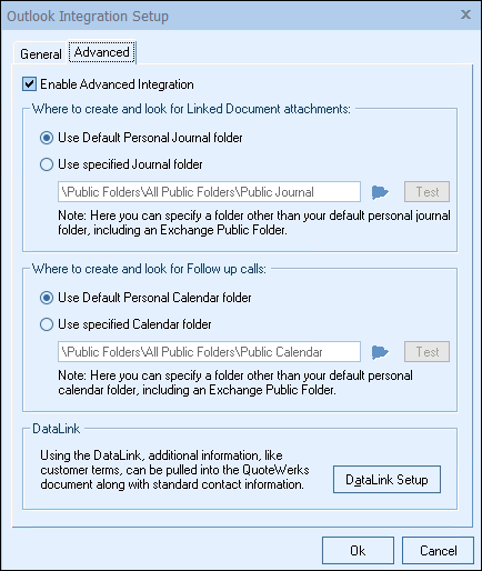 Here you will have the option to use the “Default Personal Journal folder” or the “specified Journal folder”. This option tells QuoteWerks where to create and look for Linked Documents. QuoteWerks creates linked documents in Outlook as Journal type items.