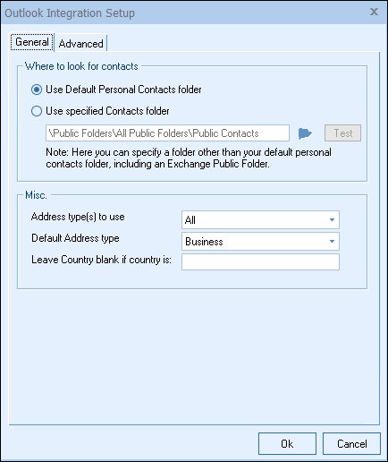 Note: The default shared public contacts folder in Exchange is ‘\Public Folders\All Public Folders’. If you want to link to a Contacts folder on an Exchange server, and your public contacts folder is not called “Public Contacts”, you can browse for this folder from this window. If you are using Outlook Business Contact Manager (BCM) locally, you will use the “Use specified Contacts folder” option to choose a local contacts folder other than the default Personal Contacts folder such as “\Business Contact Manager\Business Contacts” |
