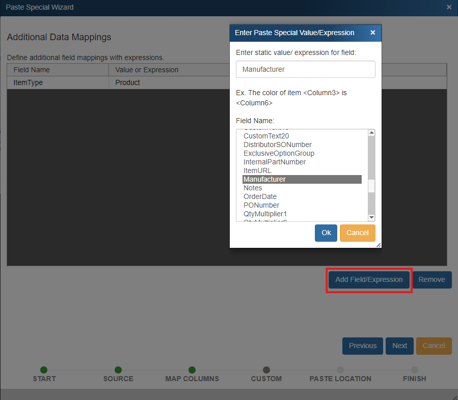 Step 4 (Additional Data Mappings): In this step, you have the option to map additional fields with static values. For example, if you wanted set the ItemType field or the Vendor field, or the Manufacturer field, etc. for all the items being imported via the past special, you can do so on this step. You can setup multiple Additional Data Mappings.