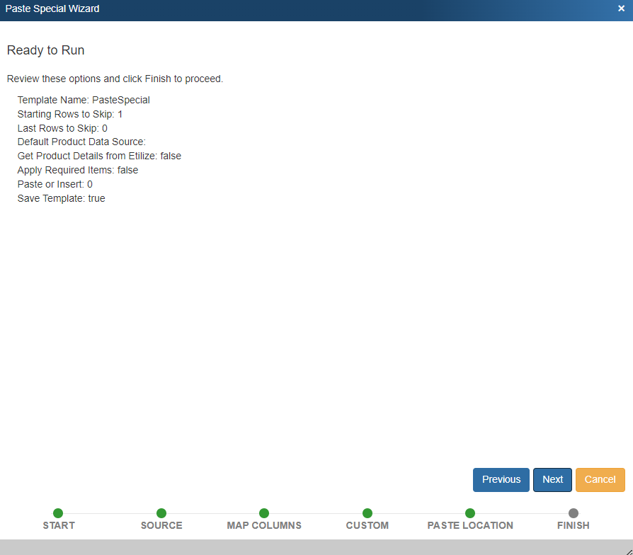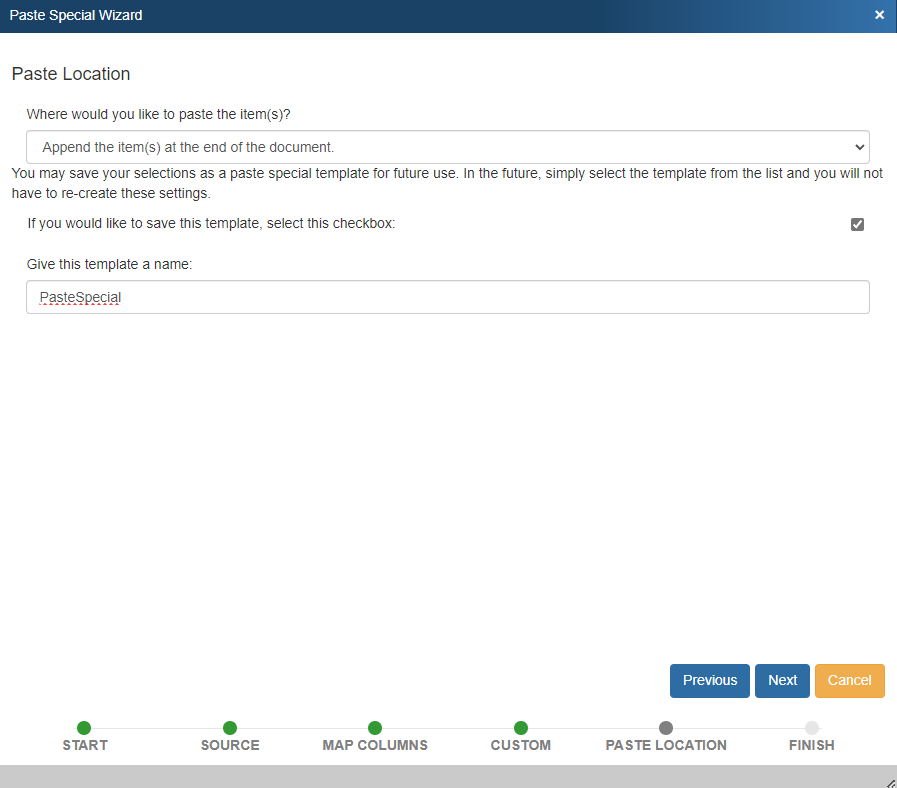 This is used to load the Paste Special Wizard with the settings from a template that you have previously saved. The benefit to using this option is that you can load all the settings you previously selected from a template, but then you can still make changes to those settings as you go through the wizard step-by-step.