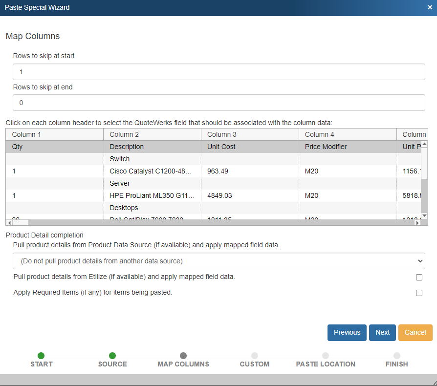 Step 3 (Map Columns): Here you have the option to specify the range of rows that you want to import from this data, map the fields from your file to fields in QuoteWerks, and determine how/if you would like to pull in product details from another data source.