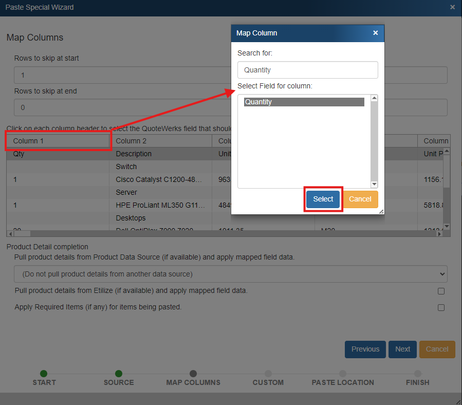 To map fields you will need to click on each column header you wish to map, search for the corresponding QuoteWerks field, select it, and click Select. In the example below we are mapping Column 1 to the QuoteWerks field of Quantity. You will want to do this for every Column that you wish to paste into the document.