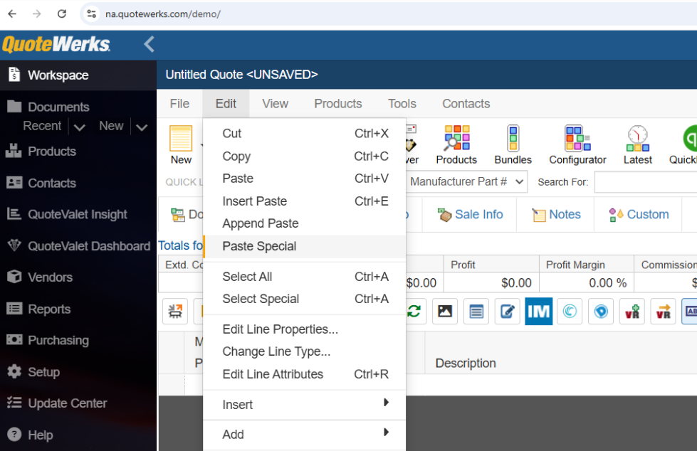 To use paste special you will need to open the Paste Special Wizard by navigating to Edit > Paste Special or right clicking anywhere in the QuoteWerks document and selecting Paste Special.