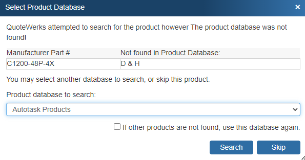 If you selected to pull product details from a Product Data Source, the Paste Special Wizard will add the items automatically only if it finds the Manufacturer Part Number in the selected database. If it does not, it will prompt you to either select a different Product Database or skip the search and add the item to the quote without product details from the product database. All information being brought in via paste special will still be included in the document.
