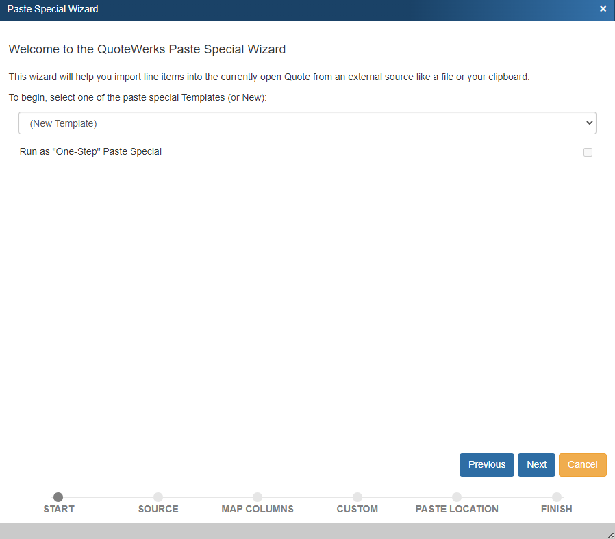 The Paste Special Wizard enables you to paste data from outside of QuoteWerks Web into QuoteWerks Web as line items in the quote. The Paste Special Wizard can retrieve information from the Windows clipboard or a local file.