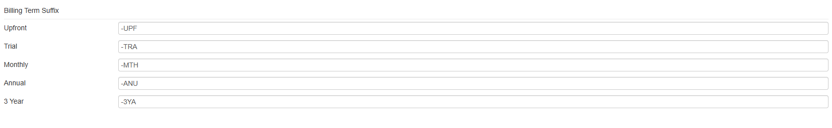 For example, based on the above settings, if you are using part number 1234 and it is on a monthly billing cycle, the amended part number will be 1234-MTH. Alternatively an annual billing cycle will have an amended part number of 1234-ANU.