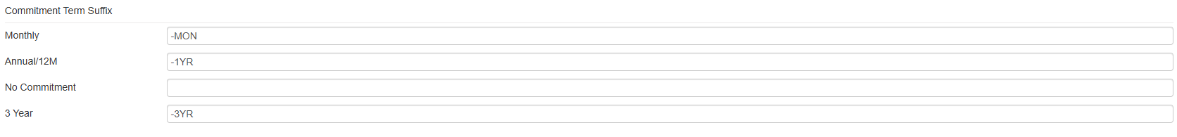 Here you can set how to amend the Pax8 part number to reflect the items commitment terms. You can set a 4 character suffix for each commitment term which will be placed at the end of the Pax8 part number and billing terms suffix.