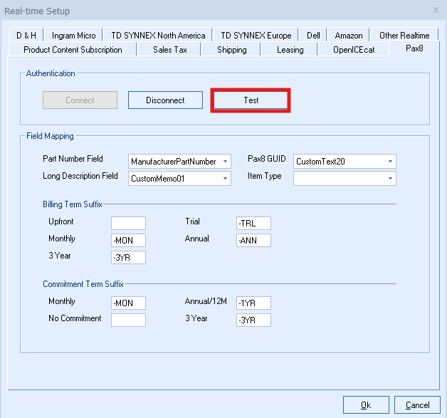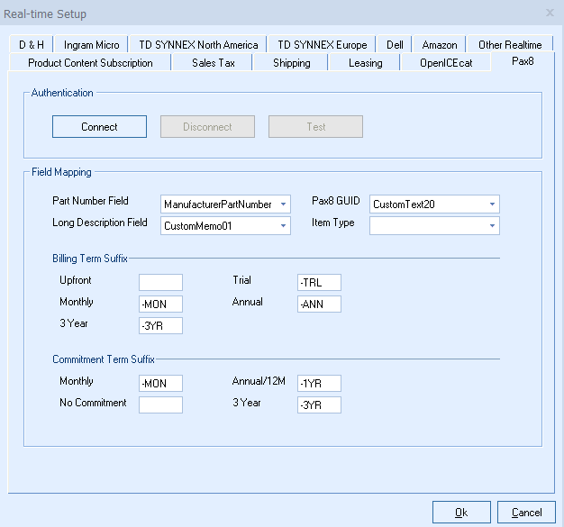 Long Description Field - set which field to place the Long Description from Pax8. This is defaulted to CustomMemo01.