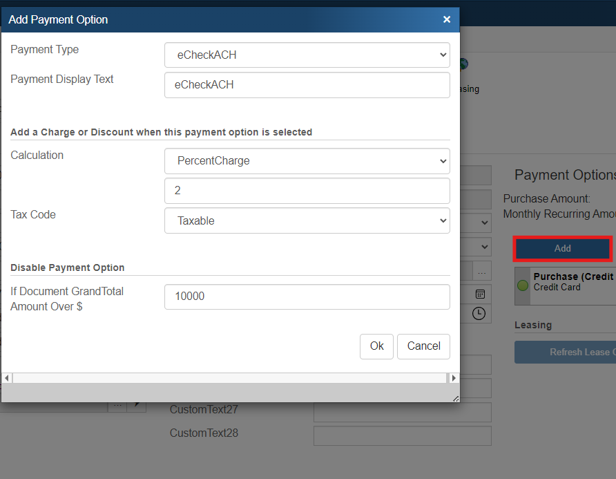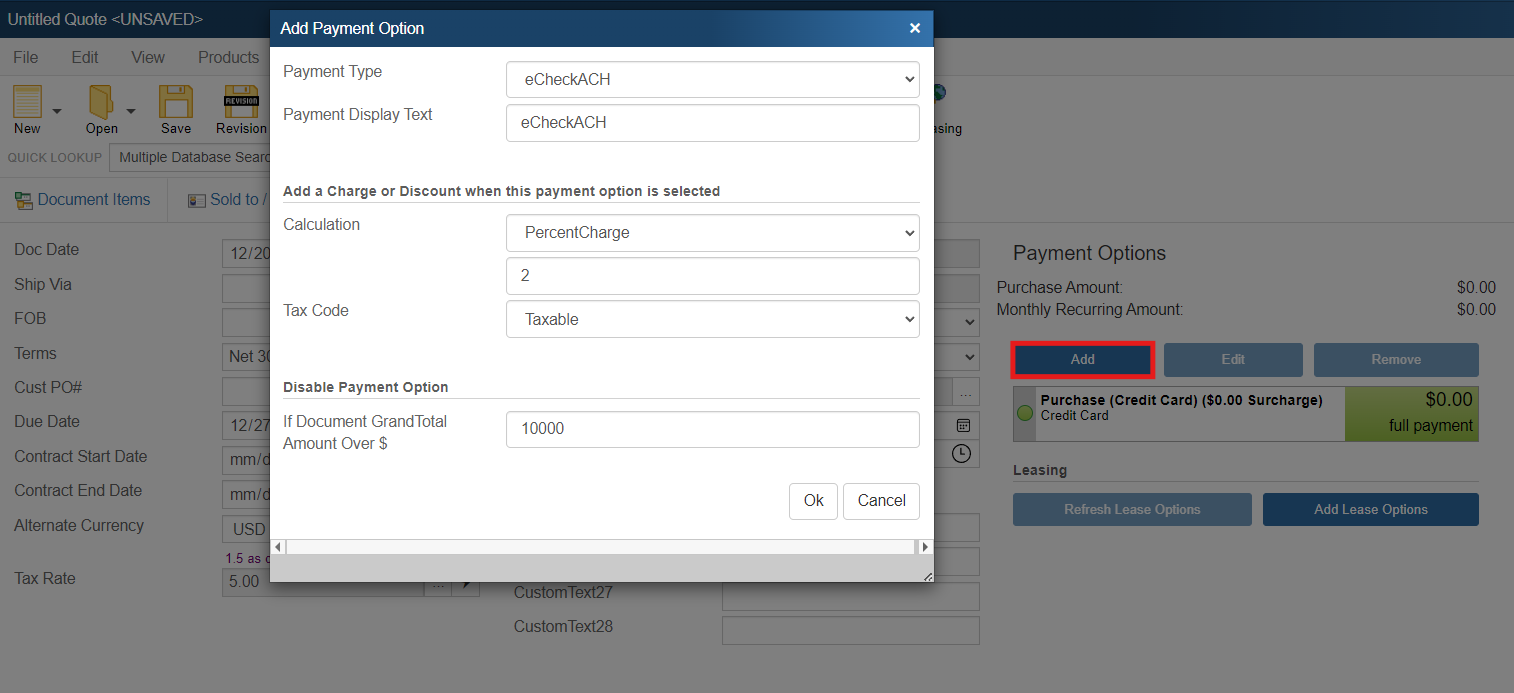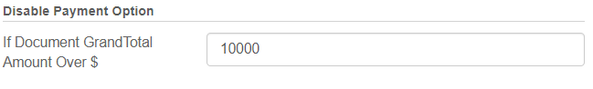 5.Users also have the option to disable a payment option if the Document total is over a certain dollar amount.  Simply type in the value where you wouldn't want this payment option to be available.  If the Grand Total of the document exceeds what is set here, this payment option would not be available to use on this quote.