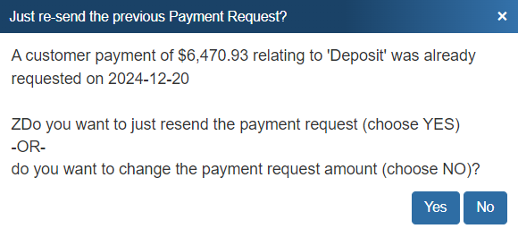 Select [Yes] if you want to simply resend the request for payment to the customer with the current payment amount and current payment options. This will let you resend the payment link via email.