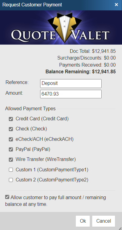 Note:The following information will only apply to users who are using QuoteValet. Users will also need to have setup their payment gateway in QuoteValet, set a deposit on the document, and set a payment option to collect payments via QuoteValet.
