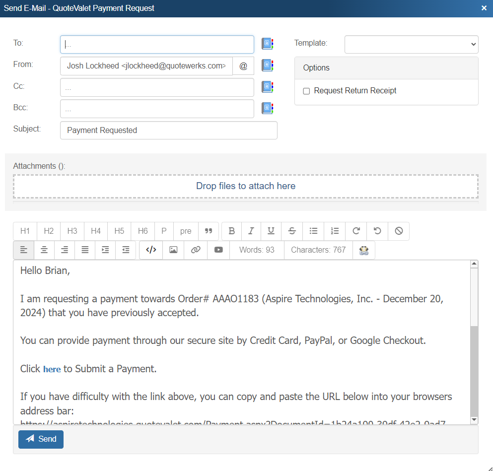 Once you make your changes and click OK, the email window will open so you can resend the payment link to the customer: