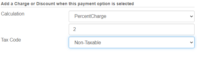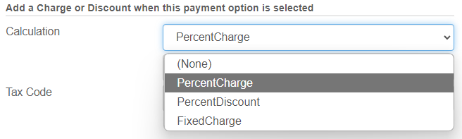 4.Next, if you want to add a percent charge, percent discount, or a fixed charge for using the selected payment type you can set that up under the Add a Charge or Discount when this payment option is selected. For example, if it is legal in your region to charge a fee for using a credit card, you could set the calculation field to "PercentCharge" and then set it to "3".  When this payment option is selected, it will automatically add a 3% surcharge to the payment total.