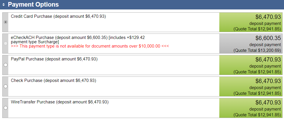 Note:Advanced users can limit which payment options are available to add to documents in QuoteValet.  This is done in the Settings Manager in using this setting: