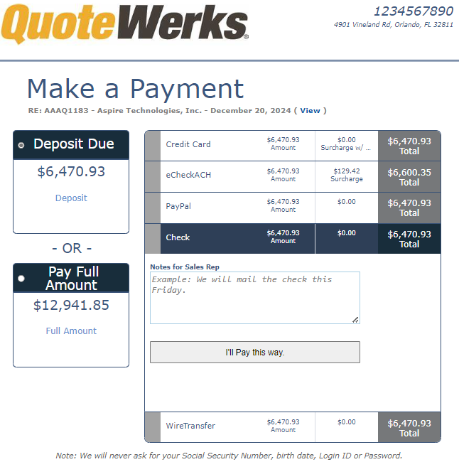The payment options supported in QuoteWerks include 7 different options.  Users can create a payment option of Credit Card, Check, ECheck (ACH), PayPal, Wire Transfer, and two custom payment options.  View the Lease Payments topic for information on using Lease Payment options.