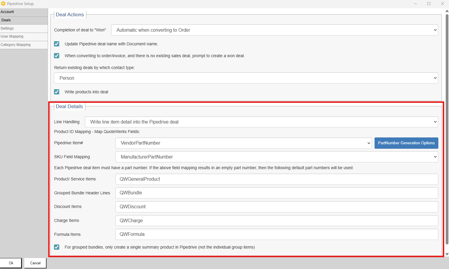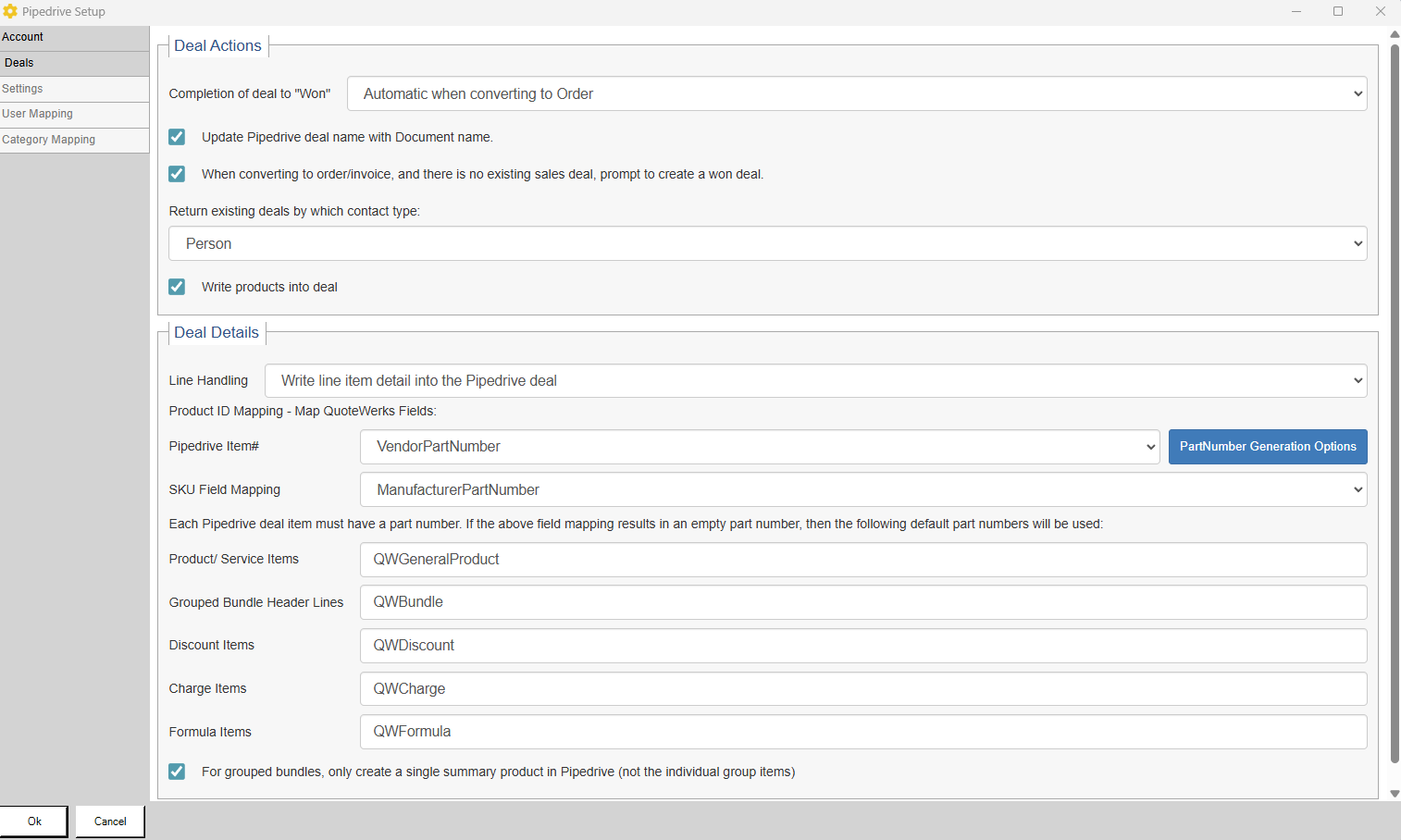 Here you will set which QuoteWerks field to map the Pipedrive Item# to. The Item# is the unique product identifier in Pipedrive. Most often this will be mapped to the Manufacturer Part # as this is the unique identifier in the QuoteWerks system. You can however choose to map this field to a number of other QuoteWerks fields including CustomText fields. If you choose to map to any field other than Manufacturer Part # you will be able to set how QuoteWerks assigns a part number by clicking on PartNumber Generation options.